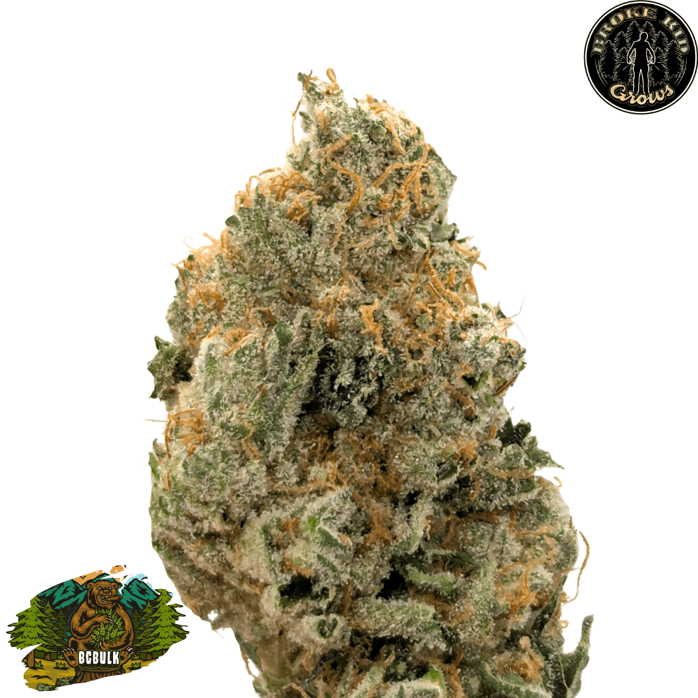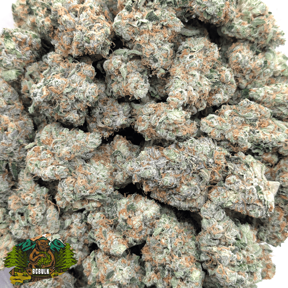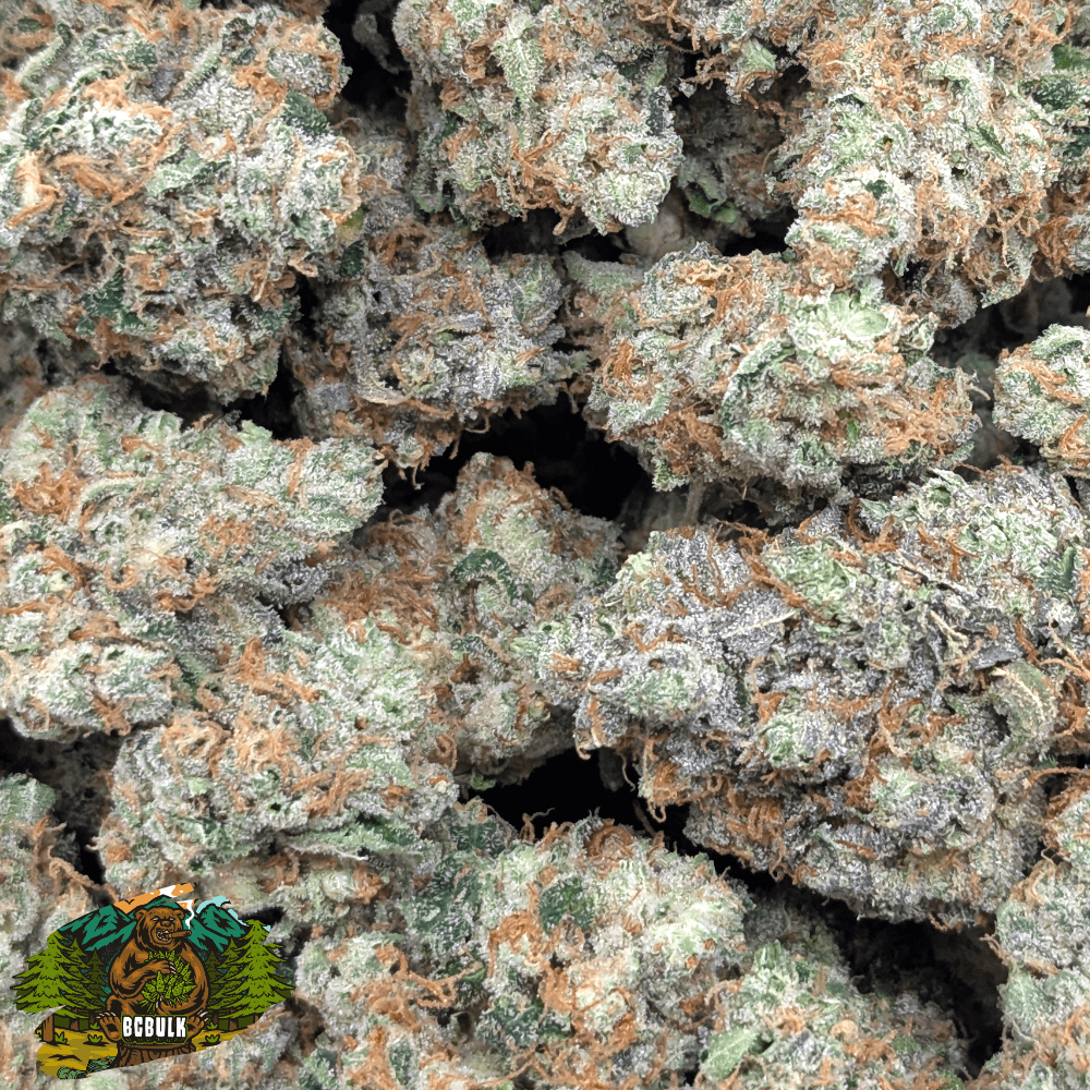 Dense and resin-packed buds show off a pale green base with deep purple hues. Bright orange pistils and a thick coat of frosty trichomes complete its frosted, premium look.