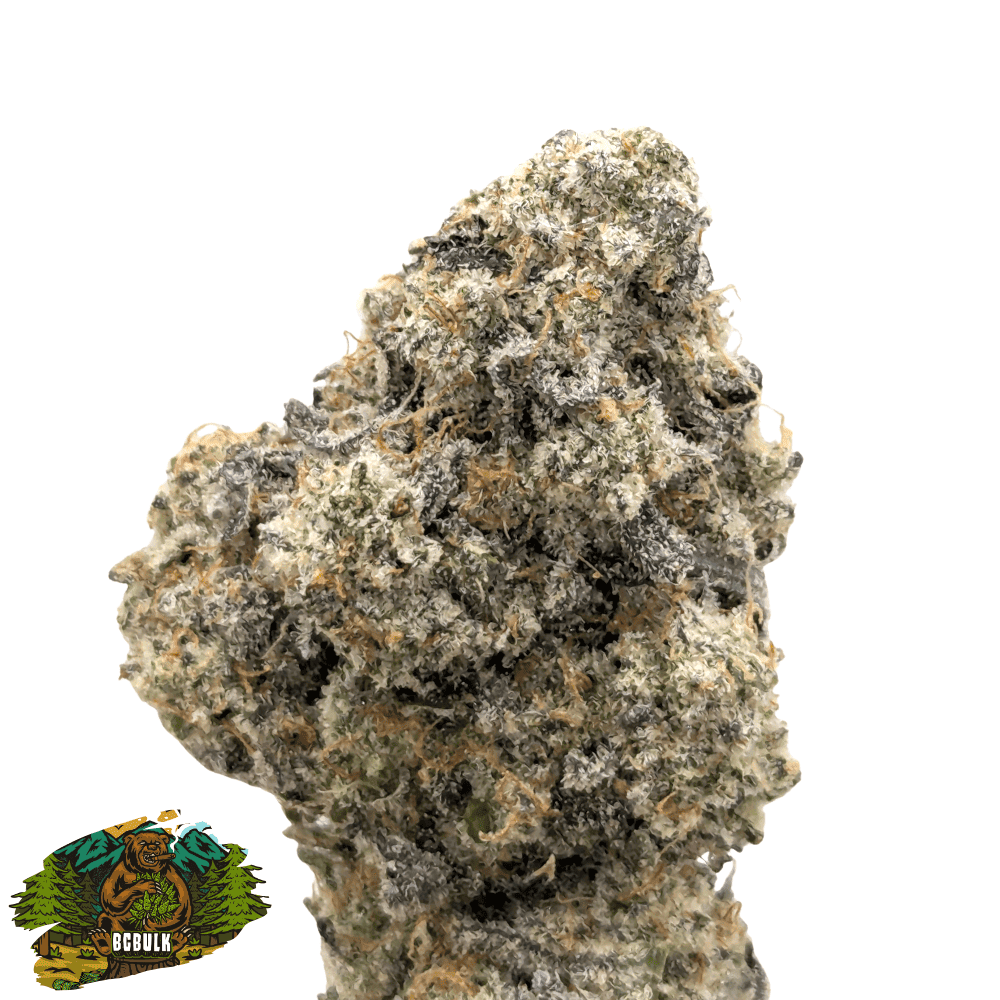 The buds are dense and chunky, with a beautiful mix of forest green and pink hues, wrapped in a thick layer of milky trichomes. Bright orange pistils weave through the frosted surface, giving this strain standout visual appeal.